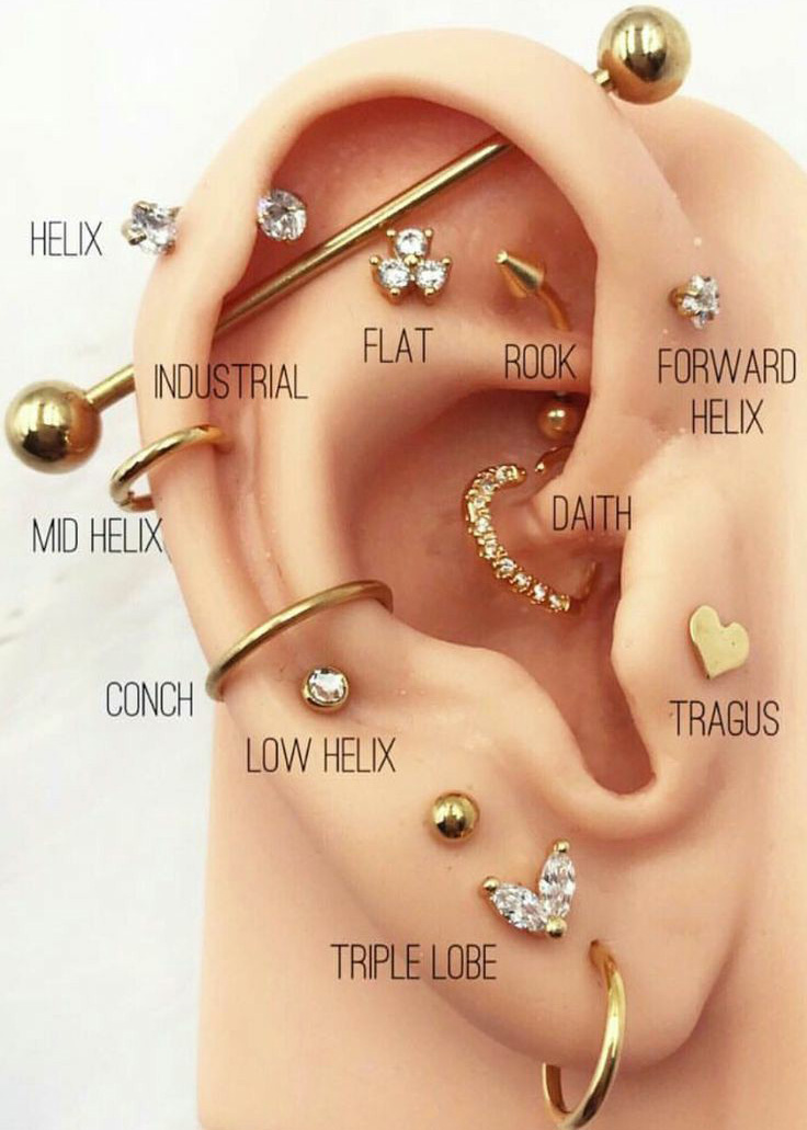 ⁃ Triple Helix Piercings- It is 3 Helix Piercings in a row, mostly connected with a single piece of spiral jewelry.